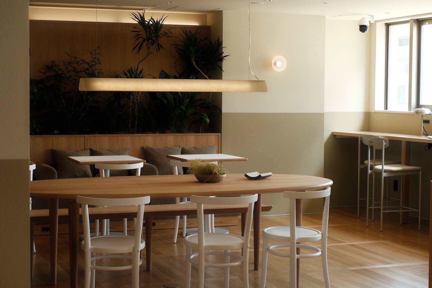 オークの〈スーパーエッグテーブル〉と〈月見ベンチ〉を、共用のリビング空間に配置。